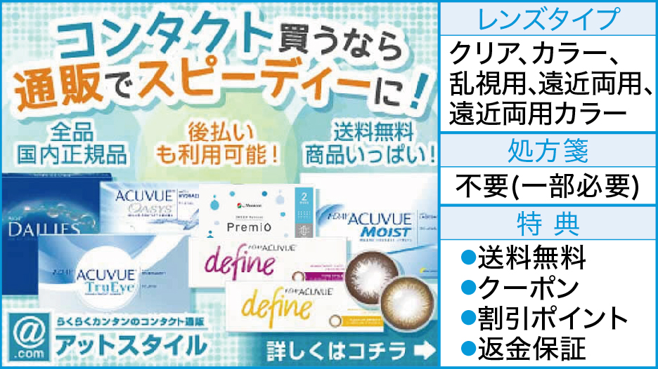 アットスタイル クリア遠近両用カラーカラー乱視用遠近両用 全商品国内正規品を取り扱っているコンタクトレンズショップです。全品ほぼ処方箋不要で購入できるコンタクト通販として多くの人が利用しています。 POINT 全商品国内正規ルート品 お試し全額返金キャンペーン(公式サイト参照) […] 続きを読む